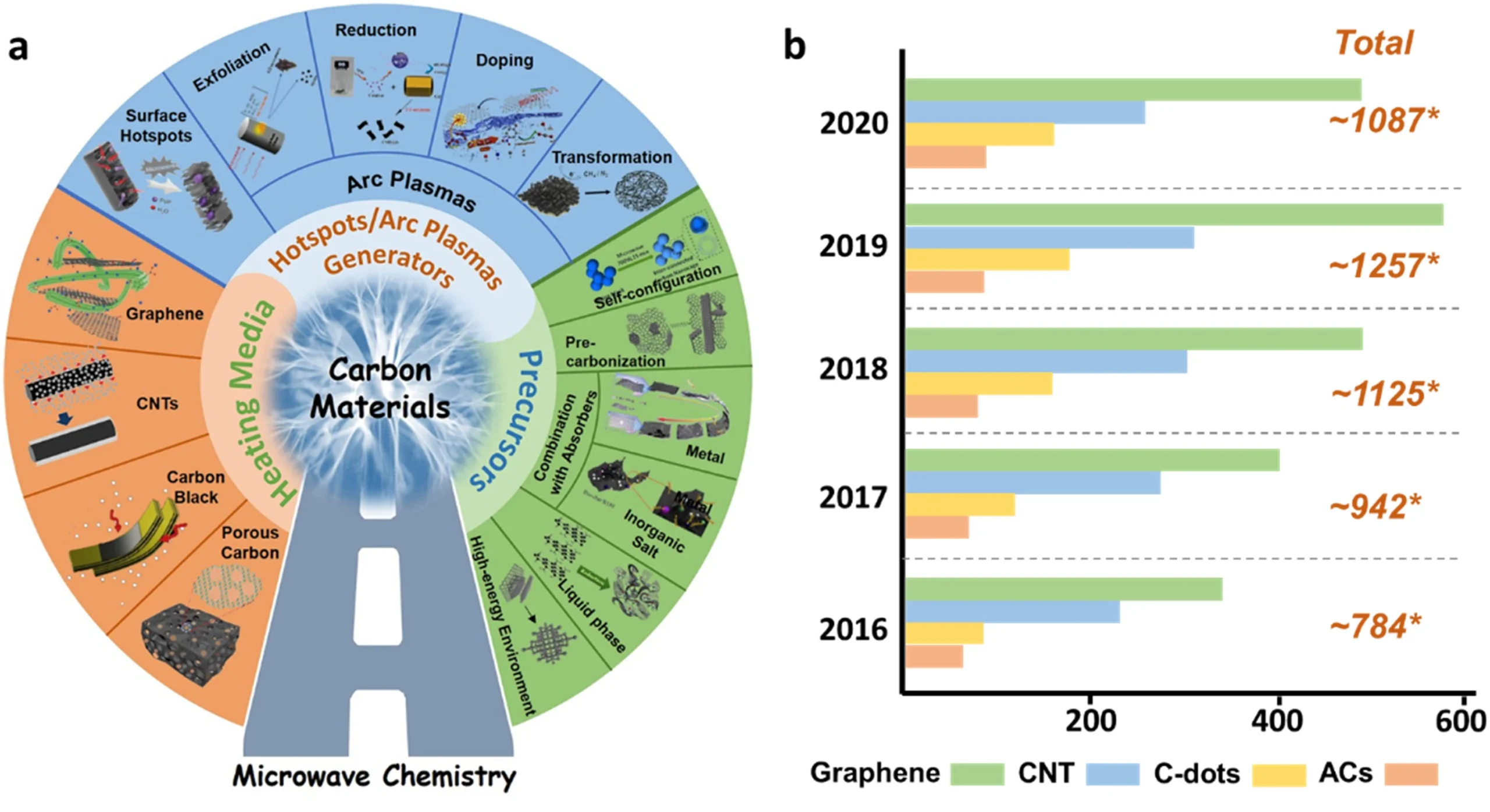 03. Para completar el cuadro, resulta indispensable citar el trabajo de (Wang, Z., Yu, C., Huang, H., Guo, W., Yu, J. y Qiu, J. 2021) que ofrece una visión holística de la incidencia de las microondas en la química del carbono, especialmente en la escala nanométrica. Según se expone “las microondas son ondas electromagnéticas que exhiben una variación sinusoidal de campos eléctricos y magnéticos. La frecuencia de microondas es de 300 MHz a 300 GHz, en la que la frecuencia de 2,45 GHz se utiliza con mayor frecuencia“. El calor conducido por la radiación electromagnética provoca la polarización y excitación de los materiales de carbono, aumentando su temperatura, provocando los efectos de desorción, exfoliación, reducción, dopado, pero más importante aún “debido a la fuerte interacción entre los electrones que se mueven casi libremente y el campo eléctrico, la energía cinética de estos electrones aumenta y les permite saltar rápidamente fuera del área conjugada en la superficie del carbono, lo que resulta en la ionización de las especies gaseosas. con una evidente emisión de luz en el tiempo y el espacio limitados. Este fenómeno se percibe como plasmas de arco o descarga. Y una generación intensiva de tales especies/plasmas ionizados puede tener un gran potencial para las reacciones de microondas involucradas debido a las características de las dimensiones de microescala y una densidad de energía alta única“.