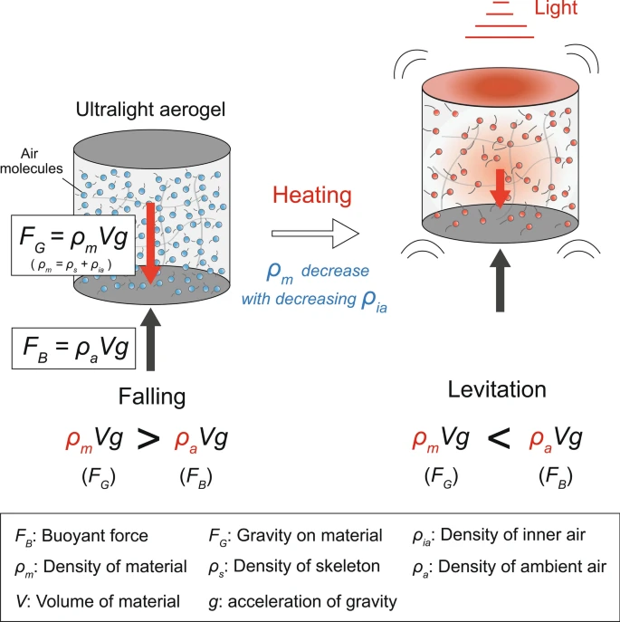 En esta investigación se concluyó que “el aerogel fabricado para el experimento se podía calentar instantáneamente utilizando una lámpara halógena debido a su alta propiedad de absorción de luz y su pequeña capacidad calorífica. Al calentarlo fue levitado por la flotabilidad del aire circundante, y el comportamiento de la levitación pudo controlarse mediante el ciclo de encendido/apagado de la fuente de luz. La investigación sobre la levitación de aerogeles de CNT (nanotubos de carbono, óxido de grafeno en forma tubular-cilíndrica) utilizando la luz solar está en curso“. El aerogel de nanotubos de carbono CNT, se probó con densidades en un rango de 0,25 a 1mg/cm-3, obteniendo una levitación instantánea con una velocidad de calentamiento de 17°C/s. Este efecto fue advertido por (Zhang, T.; Chang, H.; Wu, Y.; Xiao, P.; Yi, N.; Lu, Y.; Chen, Y. 2015) en su trabajo de propulsión macroscópica con luz directa sobre el grafeno a granel. Se descubrió que “los objetos basados en macro grafeno podrían ser propulsadosdirectamente por un láser de nivel de vatios, e incluso la luz solar, hasta una escala inferior al metro… la propulsión podría mejorarse aún más aumentando la intensidad de la luz y/o mejorando el área de iluminación“.