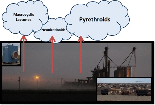 03. Retomando el análisis de (Peterson, E.M.; Green, F.B.; Smith, P.N. 2020), se descubre que “muchos patios de alimentación establecidos en los últimos 50 años han estado en áreas que reciben relativamente poca lluvia, similar a las llanuras altas. Estas regiones (Llanuras de EE. UU., México, América del Sur y el norte de Australia), son propensas a las sequías, lo que agrava la generación de partículas y la emisión de plaguicidas de los patios de alimentación… Por lo tanto, es probable que se produzca la diseminación aérea de insecticidas en el medio ambiente local, a través de MP (micropartículas), en los patios de alimentación de todo el mundo, independientemente de las condiciones climáticas“. Este panorama podría encajar con el de las llanuras y explotaciones agrícolas y ganaderas en España, especialmente en el periodo estival, en el que las condiciones de humedad y temperatura, son idóneas para la evaporación y el levantamiento de partículas en suspensión.