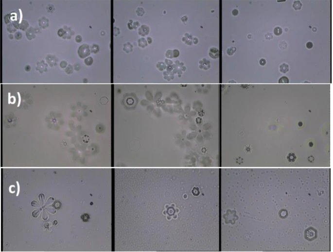 04. Los investigadores señalan que el óxido de grafeno en forma de GGON presenta características idóneas para la nucleación del hielo, debido a sus estructuras bidimensionales y propiedades térmicas y mecánicas, tal como han demostrado en su experimento, con mejores resultados que otros materiales empleados habitualmente para la siembra de nubes, a saber “yoduro de plata” y “polvo de caolinita“. Según afirman los autores “aunque el grafeno G es hidrófobo, el óxido de grafeno GO es hidrófilo y la existencia de estas dos propiedades una al lado de la otra proporciona el fondo beneficioso para la nucleación del hielo“. Otro factor que favorece la nucleación del hielo es la ausencia o baja cantidad de carbono orgánico en el material, lo que influye positivamente en la cristalización.