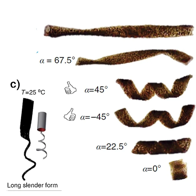Pues bien, ésta forma fue vista en el artículo de (Chen, X.Z.; Hoop, M.; Mushtaq, F.; Siringil, E.; Hu, C.; Nelson, B.J.; Pané, S. 2017) relativo a nanorobots impulsados magnéticamente. En concreto se refiere a nanorobots nadadores blandos en forma de cinta hechos con hidrogeles que responden a estímulos, véase figura 2 y 3.