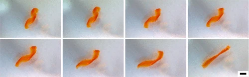 Pues bien, ésta forma fue vista en el artículo de (Chen, X.Z.; Hoop, M.; Mushtaq, F.; Siringil, E.; Hu, C.; Nelson, B.J.; Pané, S. 2017) relativo a nanorobots impulsados magnéticamente. En concreto se refiere a nanorobots nadadores blandos en forma de cinta hechos con hidrogeles que responden a estímulos, véase figura 2 y 3.