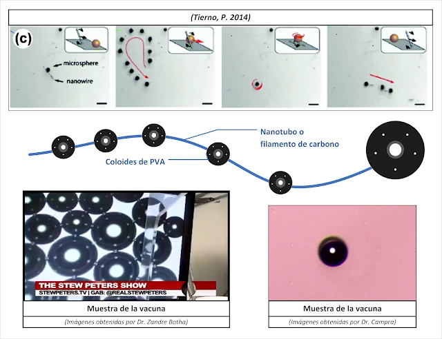 Este descubrimiento es muy importante, puesto que los nano-robots pueden auto-configurarse en soluciones acuosas, a partir de los materiales afines y presentes en su entorno, en un conjunto desordenado o caótico, similar al que se encuentra en las vacunas del c0r0n@v|rus. De esta forma, patrones como las burbujas de PVA (Polyvinyl Alcohol, o bien Alcohol de polivinilo), entre otros posibles materiales esferoides, observados en las muestras de la vacuna (véase figura 9, cuadros inferiores), podrían ser asimiladas en nanotubos carbono para conformar este tipo de objetos móviles. De hecho, esto se demuestra parcialmente en el trabajo sobre PVA de (Yao, Z.C.; Yuan, Q.; Ahmad, Z.; Huang, J.; Li, J.S.; Chang, M.W. 2017) en donde se indica que “En tiempos recientes, la diversificación de la estructura de la fibra a través de ES (proceso de electrohilado) se ha demostrado mediante la ingeniería de estructuras Janus, trenzadas y núcleo-capa. Además de estas estructuras, las fibras con cuentas también están emergiendo como arquitecturas valiosas, aunque la uniformidad de dichos materiales es significativamente diferente a la de sus contrapartes perfectamente electrohiladas. Las fibras con cuentas se preparan comúnmente (cuando se usa ES), mediante el despliegue de soluciones que poseen bajas concentraciones de polímero“. Dicho de otra forma, las fibras con cuentas de PVA o lo que es lo mismo, coloides, son un instrumento para el suministro y entrega de fármacos en aplicaciones biomédicas contra el cáncer (Zhang, Y.; He, Z.; Yang, F.; Ye, C.; Xu, X.; Wang, S.; Zou, D. 2021) e incluso la regeneración de tejidos en combinación con el ya conocido Chitosan (Grande-Tovar, C.D.; Castro, J.I.; Valencia, C.H.; Navia-Porras, D.P.; Mina-Hernández, J.H.; Valencia, M.E.; Chaur, M.N. 2019). Es en este punto donde se encuentra la segunda identificación de los patrones observados en las vacunas del c0r0n@v|rus, en la literatura científica, tal como se puede apreciar en la figura 10.