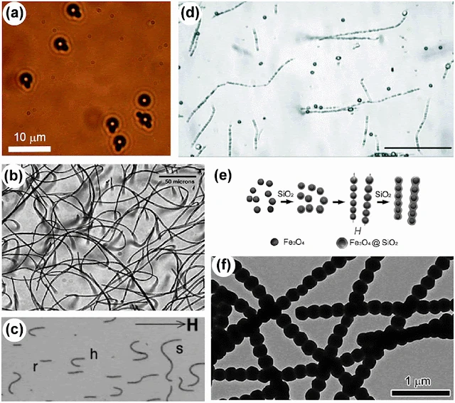 Una de las características más investigadas en el campo de los coloides es su autoensamblaje, como si de bloques de construcción se tratase. Para ello existen diversos métodos, según ilustra (Tierno, P. 2014) en su investigación: a) Mediante coloides paramagnéticos recubiertos de estreptavidina y hebras de ADN con biotina (caso anterior); b) Mediante filamentos magnéticos flexibles unidos por ácido poliacrílico absorbido (PAA) y moléculas de bisbiotina-poli(etilenglicol) (PEG); c) Mediante cadenas magnéticas rígidas, funcionalizadas con sílice, véase figura 8.