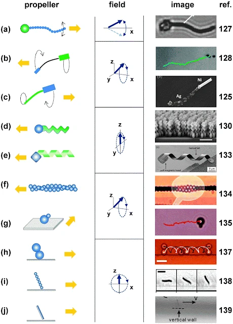 En palabras de (Tierno, P. 2014), se indica que la figura 6 “muestra la mayoría de las hélices magnéticas realizadas recientemente, con el campo de actuación mostrado en la columna central. Las características comunes son el uso de un campo magnético que es uniforme y depende del tiempo, de manera que el movimiento neto de las partículas no es el resultado de la presencia de un gradiente, sino que surge de un proceso de rectificación, donde las oscilaciones o rotaciones se transforman en movimiento directo. Hay principalmente tres estrategias que se han utilizado con éxito: 1) flexibilidad en la unidad coloidal (a-c); 2) Helicidad en la forma (d-f); 3) Proximidad cercana a un límite (g-j)“. Esto demuestra que la vacuna podría contener este tipo de nano-robots nadadores con el objetivo de transportar fármacos a un órgano o tejido definido como objetivo.