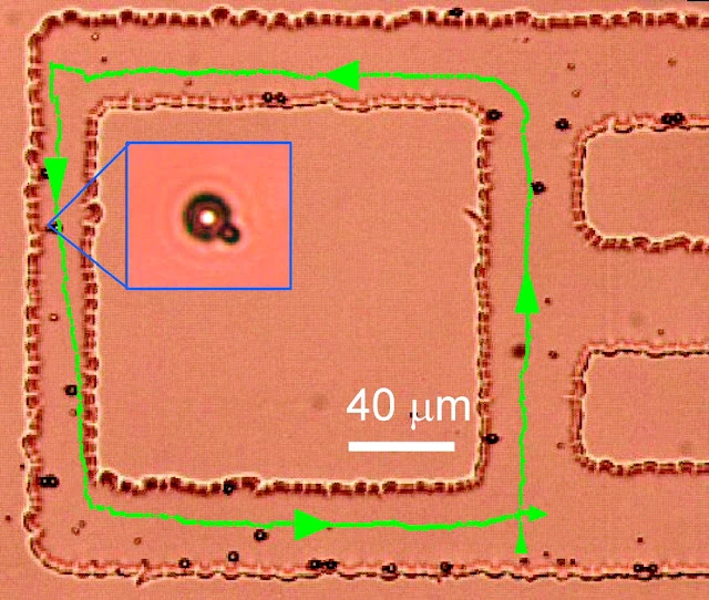 La precisión del movimiento es muy elevada, tal como se observa en la figura 5, en donde se demuestra cómo los nadadores pueden reproducir una ruta entre microcanales en un circuito grabado. Esto demuestra que las ondas electromagnéticas (microondas), son adecuadas para controlar inalámbricamente estos objetos, y dirigirlos al objetivo deseado. De hecho, el investigador principal, Pietro Tierno indica en una nota de prensa (Universidad de Barcelona. 2008), que “es muy fácil modificar la superficie química de estas partículas y dirigirlas mediante campos magnéticos hasta que contacten con células o estructuras diana. Así puede diseñarse una nueva generación de transportadores con una gran capacidad de seleccionar el objetivo biológico“.
