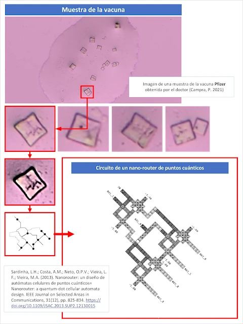 En esta ocasión, analizando una de las imágenes obtenidas por el doctor Campra, correspondiente a una muestra de la vacuna Pfizer, véase figura 1, se ha descubierto, lo que con gran probabilidad, es un nanorouter o parte de su circuitería. En la imagen original, se aprecia una gota bien delimitada en la que aparecen unas estructuras cristalinas de formato cuadrangular o cúbico. Si se observa con detenimiento, se atisban unas marcas en dichos cristales, con un patrón regular, bien delimitado en algunos casos, pero limitado por la óptica del microscopio.