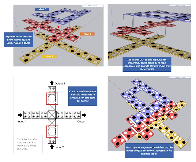 Resulta importante explicar que los circuitos conformados a base de células QCA, pueden operar en varias capas superpuestas, lo que permite una estructura 3D (tridimensional) para crear electrónica mucho más compleja y comprimida, véase figura 6.