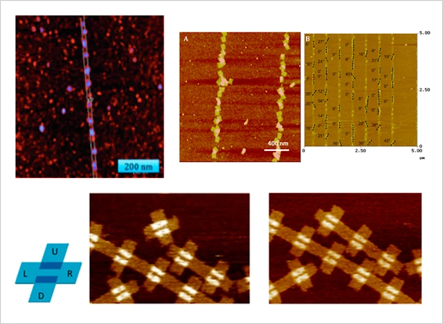 Aunque parezca imposible, el autoensamblaje de circuitos es una posibilidad a considerar en la hipótesis que se viene explicando. Según (Huang, J.; Momenzadeh, M.; Lombardi, F. 2007) “Los desarrollos recientes en la fabricación de QCA (que implican implementaciones moleculares) han cambiado sustancialmente la naturaleza del procesamiento. En tamaños de características muy pequeños, se prevé que se utilizará el autoensamblaje o la deposición celular a gran escala sobre sustratos aislados. En estas implementaciones, las celdas QCA (cada una compuesta por dos dipolos) se depositan en pistas paralelas en forma de V. Las celdas QCA están dispuestas en un diseño denso y el cálculo se produce entre celdas adyacentes. Estas técnicas de fabricación son muy adecuadas para la implementación molecular“. Sin embargo, también existen otros métodos, como los nanopatrones de ADN (Hu, W.; Sarveswaran, K.; Lieberman, M.; Bernstein, G.H. 2005), con los que se crea una plantilla para la alineación de los puntos cuánticos de grafeno, conformando las células de QCA, generando con ello la circuitería ya mencionada, véase figura 10.
