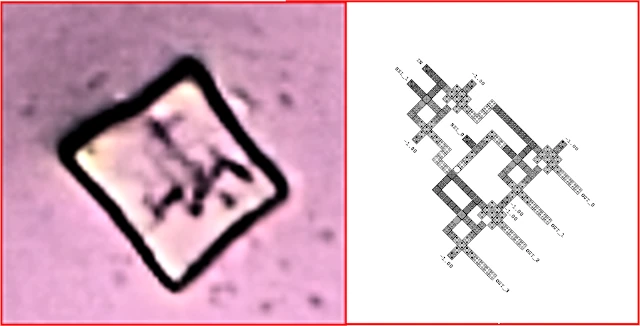 El hallazgo ha sido posible aislando cada cristal cuadrangular, aplicando un proceso de rasterizado, enfoque y delimitación de los bordes de la imagen, a fin de pronunciar aún más las marcas observadas. Una vez completado este proceso, se dibujó un borrador con las líneas y patrones inscritos en el cristal, creando un perfil limpio de lo que en realidad parecía un circuito. Fue muy llamativo el hecho de encontrar líneas paralelas y perpendiculares con una distribución alejada de los patrones fractales, lo que permitió inferir automáticamente la posibilidad de que hubiera sido producto de la manufactura. Por ello, se buscaron patrones similares en la literatura científica, que tuvieran un esquema similar, parecido al circuito que se acababa de dibujar. El resultado de la búsqueda fue casi inmediato, ya que se encontró el patrón de un nanorouter de puntos cuánticos, tal como se observa en la figura 2.