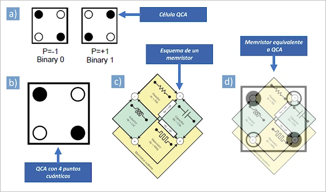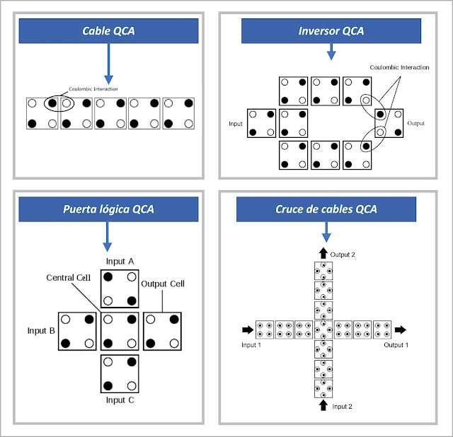 - Conforme a las explicaciones del trabajo de (Sardinha, L.H.; Costa, A.M.; Neto, O.P.V.; Vieira, L.F.; Vieira, M.A. 2013), se distingue elconcepto de punto cuántico y célula de puntos cuánticos, véase figura 4. La célula QCA está conformada por cuatro puntos cuánticos cuya polarización es variable. Esto permite distinguir el código binario de 0 y 1 en función de la carga positiva o negativa de los puntos cuánticos. En palabras de los autores se explica de la siguiente forma “Las unidades básicas de los circuitos QCA son células hechas de puntos cuánticos. Un punto, en este contexto, es solo una región donde se puede ubicar o no, una carga eléctrica. Una celda QCA tiene cuatro puntos cuánticos ubicados en las esquinas. Cada celda tiene dos electrones libres y móviles que pueden hacer un túnel entre los puntos cuánticos. Se supone que no se permite la construcción de túneles hacia el exterior de la celda debido a una barrera de alto potencial“. Extrapolado a los puntos cuánticos de grafeno, conocidos como GQD, que fueron identificados en muestras de sangre (debido a la fluorescencia emitida), una célula QCA requeriría cuatro GQD para componerse, lo cuál es perfectamente compatible con la descripción dada por los investigadores. Esto queda corroborado también por (Wang, Z.F.; Liu, F. 2011) en su trabajo titulado “Puntos cuánticos de grafeno como bloques de construcción para autómatas celulares cuánticos“, en donde se confirma el uso del grafeno para crear este tipo de circuitos.