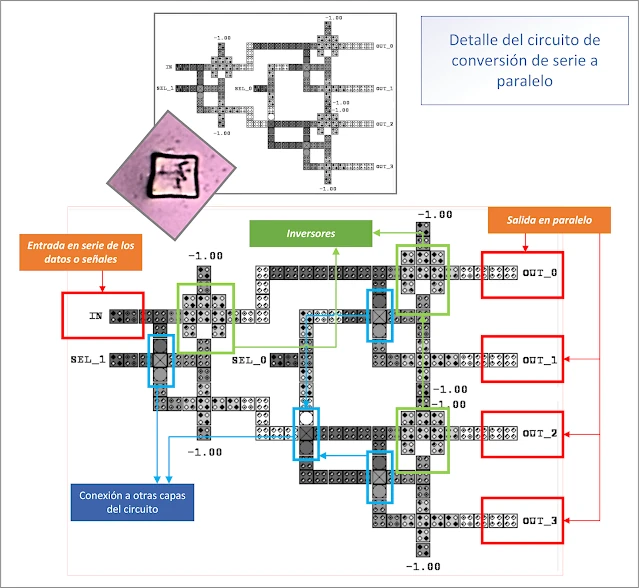 Para desarrollar un nanorouter, según los investigadores (Sardinha, L.H.; Costa, A.M.; Neto, O.P.V.; Vieira, L.F.; Vieira, M.A. 2013), se necesitan varias estructuras de circuitos, en concreto, los cruces de cables (que conforman puertas lógicas), los demultiplexores (demux) y los convertidores de paralelo a serie, véase figura X. Los “demux” son dispositivos electrónicos capaces de recibir una señal en el QCA de entrada (input) y enviarla a una línea de salida de entre varias disponibles (output), lo que permite enrutar la señal para su posterior procesamiento. El convertidor de paralelo a serie es un circuito capaz de tomar varios conjuntos de datos en una entrada (input), transportarlos por diferentes cables QCA y transmitirlos en diferentes instantes de tiempo por los cables de salida (output). Éste sería muy, el componente advertido en las muestras de la vacuna, véase figura 7.