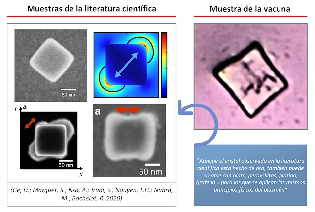 Los nanoemisores plasmónicos pueden adquirir forma de cubo, que sería el caso observado en la muestra de la vacuna, pero también forma esférica y discoidal, pudiendo ser autoensambladas, para conformar nano-microestructuras más grandes (Devaraj, V.; Lee, J.M.; Kim, Y.J.; Jeong, H.; Oh, J.W. 2021). Entre los materiales con los que se podría producir este nanoemisor plasmónico se encuentran el oro, plata, perovskitas y el grafeno, véase (Oh, D.K.; Jeong, H.; Kim, J.; Kim, Y.; Kim, I.; Ok, J.G.; Rho, J. 2021 | Hamedi, H.R.; Paspalakis, E.; Yannopapas, V. 2021 | Gritsienko, A.V.; Kurochkin, N.S.; Lega, P.V.; Orlov, A.P.; Ilin, A.S.; Eliseev, S.P.; Vitukhnovsky, A.G. 2021 | Pierini, S. 2021), aunque es probable que se puedan emplear otros muchos.