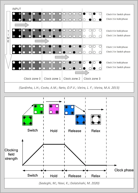 Finalmente, aunque ya se puede deducir de la naturaleza, características y propiedades de los circuitos de células QCA, hay que destacar el concepto de velocidad de reloj. De hecho, resulta interesante, la capacidad de estos componentes electrónicos para funcionar de forma casi autónoma, sin necesidad de un procesador dedicado. Esto se debe a que los cables de células QCA pueden medir el tiempo de transferencia de las señales entre las distintas celdas, en lo que se denomina “zonas de reloj“, véase figura 9 y las siguientes investigaciones (Sadeghi, M.; Navi, K.; Dolatshahi, M. 2020 | Laajimi, R.; Niu, M. 2018 | Reis, D.A.; Torres, F.S. 2016 | Mohammadyan, S.; Angizi, S.; Navi, K. (2015). Este efecto permite la transmisión de las señales a través del circuito, pero también permite crear una frecuencia de reloj, que es su propia velocidad de proceso. Si a este concepto se une, el uso de materiales superconductores como el grafeno y más específicamente los puntos cuánticos de grafeno, entonces, pueden conseguirse velocidades de procesamiento muy elevadas.