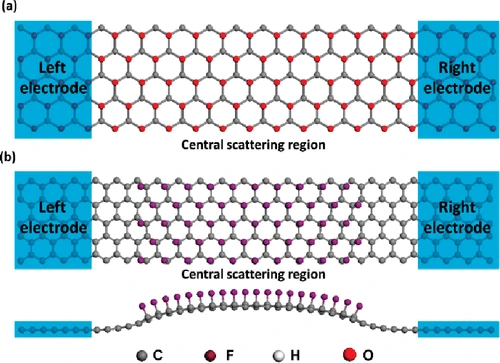 02. La investigación de (Li, L.; Qin, R.; Li, H.; Yu, L.; Liu, Q.; Luo, G.; Lu, J. 2011) analiza “la posibilidad del grafeno funcionalizado como un dispositivo espintrónico bidimensional de alto rendimiento. Se encuentra que el grafeno funcionalizado con O (oxígeno) en un lado e H (hidrógeno) en el otro lado en la conformación del electrodo, conforman un metal ferromagnético con una eficiencia de filtro de giro de hasta el 54% con un sesgo finito… la válvula de giro del espín se controla introduciendo un campo magnético para estabilizar su estado ferromagnético. La magnetorresistencia a temperatura ambiente resultante es de hasta un 2200%, que es un orden de magnitud mayor que los valores experimentales disponibles“. Finalmente concluyen que “en comparación con los dispositivos espintrónicos de nanocintas de grafeno ultrafinos, los grafenos funcionalizados permiten una corriente mucho más grande con menos requisitos en la técnica de fabricación y son más competitivo“.