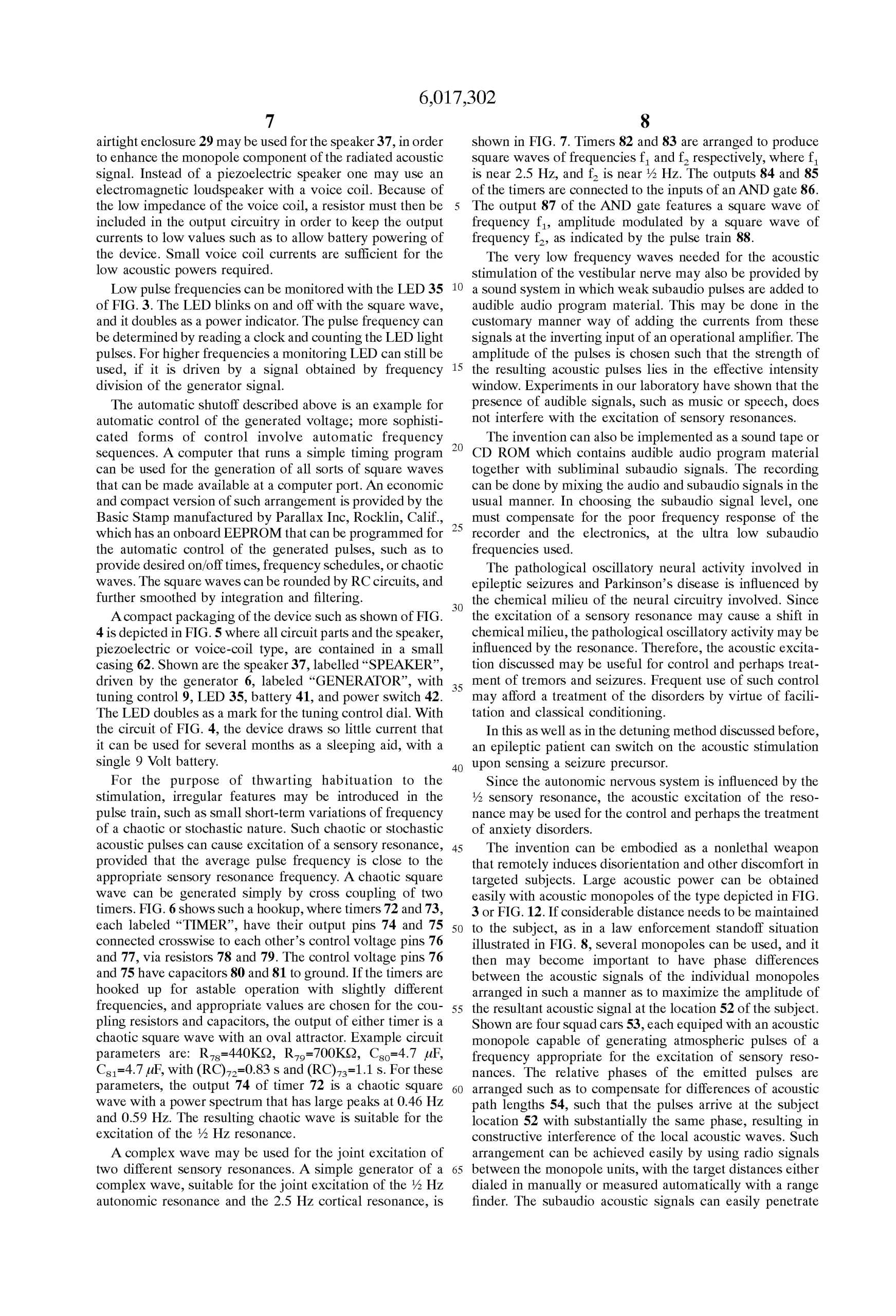 El descubrimiento de que la estimulación acústica subaudio profundamente subliminal puede influir en el sistema nervioso central sugiere un método y un aparato para manipular el sistema nervioso de un sujeto induciendo pulsos acústicos atmosféricos subliminales de frecuencia subaudio en los oídos del sujeto. Al hacerlo, se puede explotar además el mecanismo de resonancia sensorial, pero hay aplicaciones importantes en las que esto no se hace. Por ejemplo, la manipulación acústica subliminal del sistema nervioso se puede utilizar clínicamente para el control de temblores y convulsiones, desafinando la actividad oscilatoria patológica de los circuitos neuronales que se produce en estos trastornos. Esto se puede hacer eligiendo una frecuencia acústica que sea ligeramente diferente de la frecuencia de la oscilación patológica. Las señales neuronales evocadas provocan entonces cambios de fase que pueden disminuir o extinguir la oscilación. La explotación del mecanismo de resonancia sintonizando las señales acústicas a la frecuencia de resonancia de una resonancia sensorial seleccionada permite otras formas de manipulación, como el control del insomnio y la ansiedad, o la facilitación de la excitación sexual.