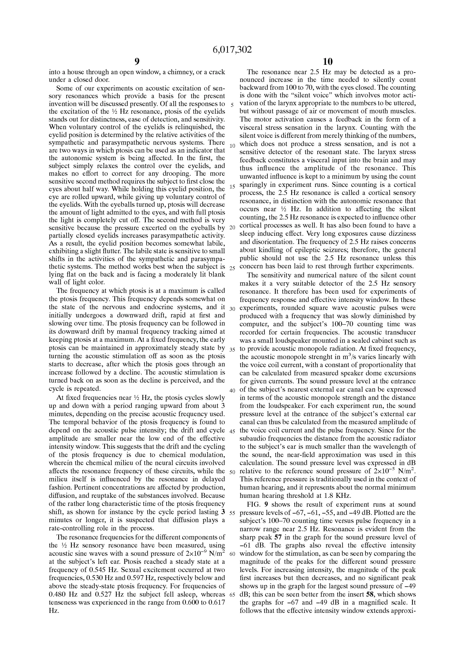 Para responder a la pregunta de si la excitación acústica de la resonancia sensorial de 2,5 Hz se produce quizás a través del nervio coclear, es necesario considerar la curva del umbral auditivo humano, tal como se muestra, por ejemplo, por Thomson (1967). La curva tiene un mínimo cerca de 1,8 KHz, donde el nivel de presión sonora umbral es 0 dB, por definición. A 10 Hz, el umbral es 105 dB. Por lo tanto, la excitación acústica pronunciada de la resonancia sensorial que se muestra en la FIG. 9 para un nivel de presión sonora de -61 dB es 166 dB por debajo del umbral auditivo a 10 Hz. La excitación se produce cerca de 2,5 Hz, y a esa frecuencia, el umbral auditivo es incluso más alto que a 10 Hz. Aunque la curva del libro de Thomson no baja de 10 Hz, la extrapolación lineal sugiere la estimación de 135 dB para el umbral a 2,5 Hz, lo que lleva el nivel de presión sonora que es efectivo para la excitación acústica de la resonancia sensorial a 196 dB por debajo del umbral estimado en la frecuencia cercana a 2,5 Hz utilizada. Este resultado prácticamente descarta la excitación a través del nervio coclear.