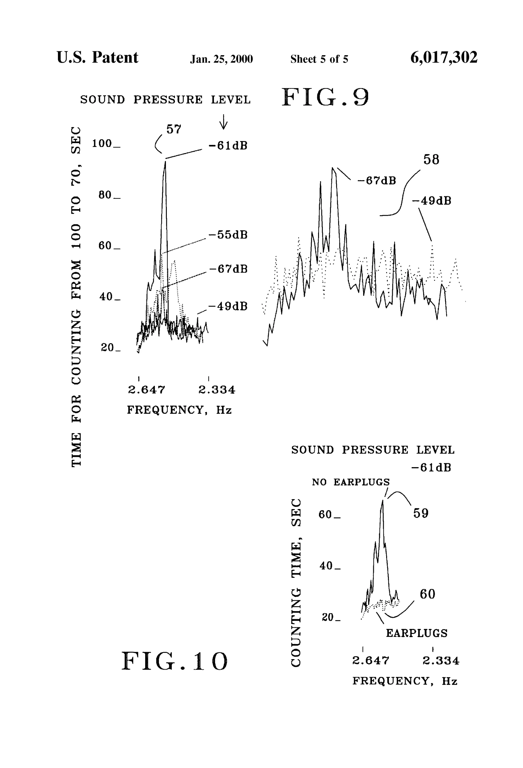 La respuesta fisiológica a la estimulación acústica de 2,5 Hz se puede evitar usando tapones para los oídos. La FIG. 10 es un gráfico del tiempo de conteo de 100 a 70 frente a la frecuencia del pulso acústico, con y sin tapones para los oídos. El nivel de presión sonora en la entrada del canal auditivo externo del sujeto fue de -6 dB para ambas ejecuciones. Sin tapones para los oídos, el tiempo de conteo tiene el cima 59, pero no se observa ningún pico significativo en gráfico 60 para la carrera en la que el sujeto usó tapones para los oídos. De estos resultados se pueden sacar dos conclusiones. En primer lugar, en los experimentos la resonancia de 2,5 Hz se excita esencialmente acústicamente en lugar de a través del campo magnético inducido por las corrientes de la bobina móvil en el altavoz. En segundo lugar, se deduce que el sonido excitante se propaga esencialmente a través del conducto auditivo externo, en lugar de a través de la piel y los huesos en la zona de las orejas, o a través de mecanorreceptores cutáneos en la piel en general.