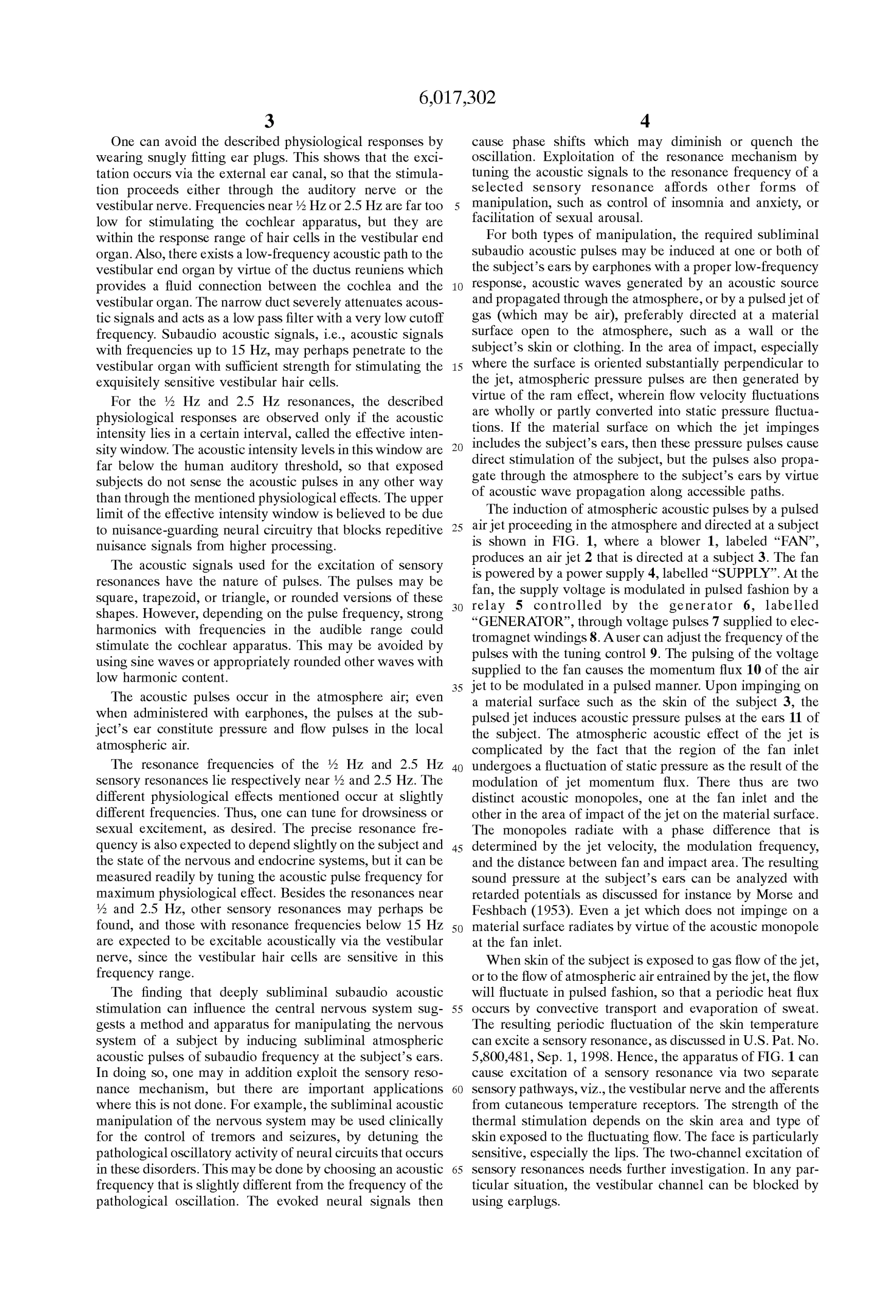 Los experimentos han demostrado que la estimulación acústica atmosférica de intensidad profundamente subliminal puede excitar en un sujeto humano las resonancias sensoriales cercanas a 1/2 Hz y 2,5 Hz. La resonancia de 1/2 Hz se caracteriza por ptosis de los párpados, relajación, somnolencia, sonrisa tónica, tensión o excitación sexual, dependiendo de la frecuencia acústica precisa cercana a 1/2 Hz que se utilice. Los efectos observables de la resonancia de 2,5 Hz incluyen una ralentización de ciertas funciones corticales, somnolencia y, después de una exposición prolongada, mareos y desorientación. El hallazgo de que estas resonancias sensoriales pueden ser excitadas por señales acústicas atmosféricas de intensidad profundamente subliminal abre el camino a un aparato y método para la manipulación acústica del sistema nervioso de un sujeto, en el que se inducen pulsos acústicos débiles en la atmósfera en los oídos del sujeto, y la frecuencia del pulso se sintoniza con la frecuencia de resonancia de la resonancia sensorial seleccionada. El método puede ser utilizado por el público en general para controlar el insomnio y la ansiedad, y para facilitar la relajación y la excitación sexual. El uso clínico del método incluye el control y quizás el tratamiento de trastornos de ansiedad, temblores y convulsiones. Una realización adecuada para estas aplicaciones es un pequeño radiador acústico subauditivo portátil alimentado por batería que puede sintonizarse con la frecuencia de resonancia de la resonancia sensorial seleccionada.