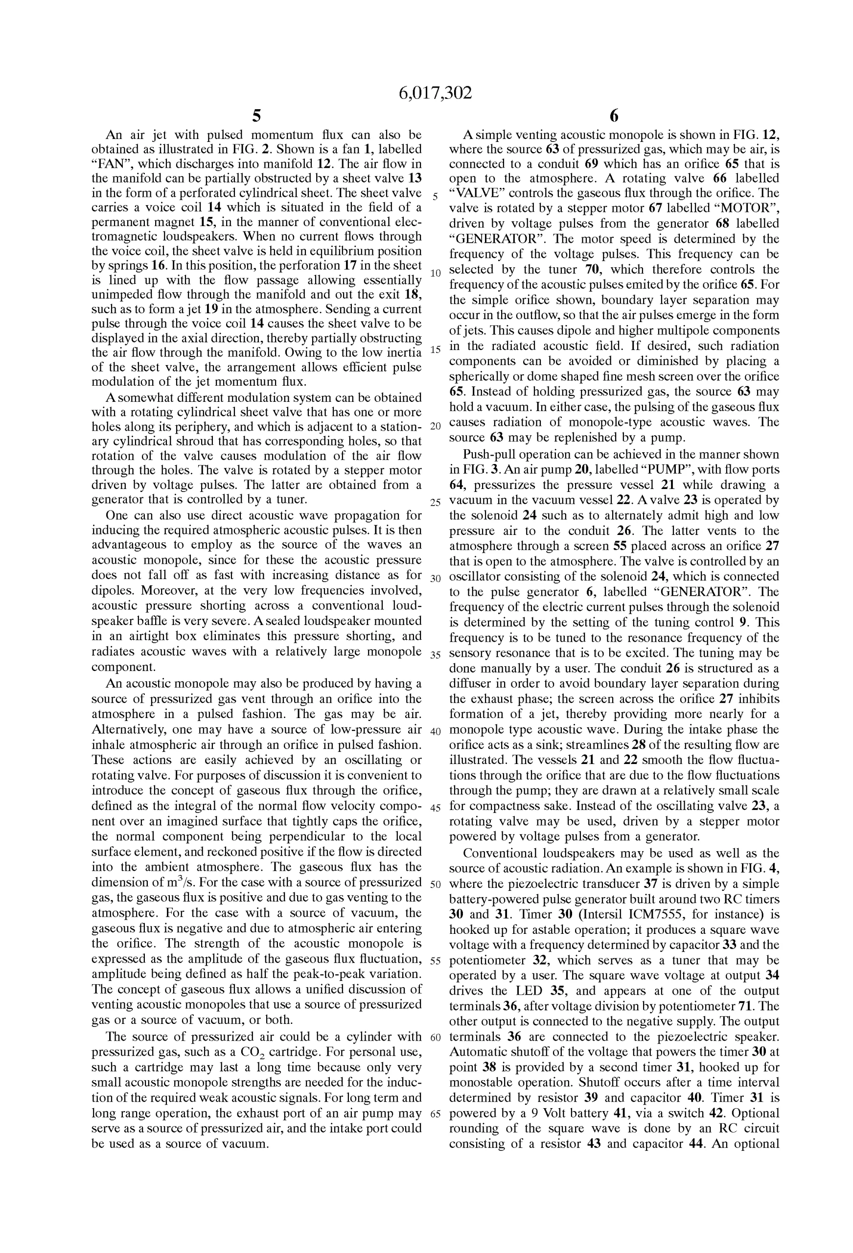 En la figura 12 se muestra un monopolo acústico de ventilación simple, donde la fuente 63 de gas presurizado, que puede ser aire, está conectada a un conducto 69 que tiene un orificio 65 que está abierto a la atmósfera. Una válvula giratoria 66 rotulada “VALVE” controla el flujo gaseoso a través del orificio. La válvula gira mediante un motor paso a paso 67 rotulado “MOTOR”, accionado por pulsos de voltaje del generador 68 rotulado “GENERATOR”. La velocidad del motor está determinada por la frecuencia de los pulsos de voltaje. Esta frecuencia se puede seleccionar mediante el sintonizador 70, que por tanto controla la frecuencia de los pulsos acústicos emitidos por el orificio 65. En el caso del orificio simple mostrado, puede producirse una separación de la capa límite en la salida, de modo que los pulsos de aire emergen en forma de chorros. Esto provoca componentes dipolares y multipolares superiores en el campo acústico irradiado. Si se desea, dichos componentes de radiación se pueden evitar o reducir colocando una pantalla de malla fina esférica o en forma de cúpula sobre el campo acústico. orificio 65. En lugar de contener gas presurizado, la fuente 63 puede contener un vacío. En ambos casos, la pulsación del flujo gaseoso provoca la radiación de ondas acústicas de tipo monopolar. La fuente 63 puede ser recargada mediante una bomba.