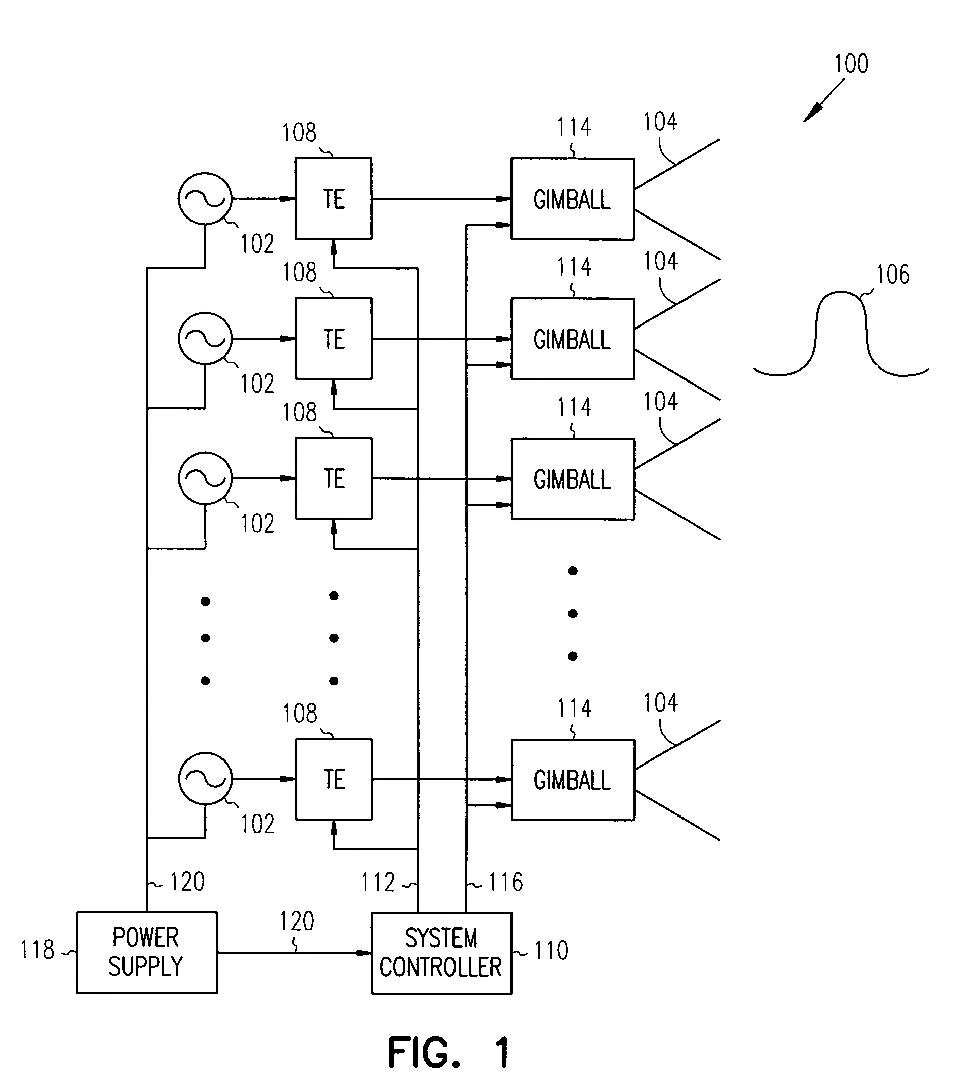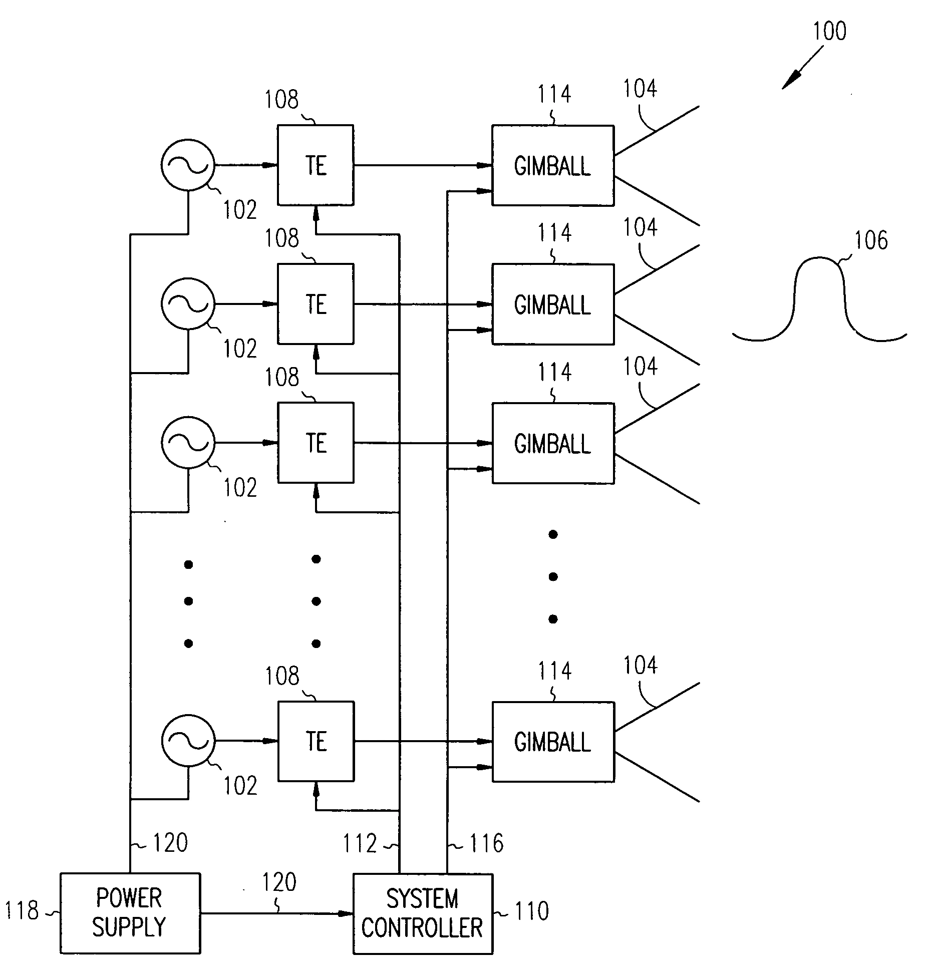 En algunas realizaciones, sistema 100 puede generar densidades de potencia promedio basadas en el número de combinaciones de antena-fuente (N), la ganancia de las antenas (G), la potencia de cada fuente (P) y la distancia desde las fuentes o el alcance (R). En estas realizaciones, la densidad de potencia promedio puede ser aproximadamente proporcional a NPG/4πR2, aunque el alcance de la invención no está limitado a este respecto. legumbres 106 puede tener una densidad de potencia máxima aproximadamente proporcional a N2PG/4πR2 debido a la combinación estadística, aunque el alcance de la invención no está limitado a este respecto. En algunas realizaciones, legumbres 106 puede ocurrir aleatoriamente en cualquier lugar dentro del ancho del haz de sistema 100. En algunas realizaciones, sistema 100 puede irradiar dentro de un ancho de haz que puede ser establecido por cualquiera de antenas 104 proporcionando un ancho de haz mucho mayor que un sistema coherente cuyo ancho de haz puede ser establecido por toda la matriz. Este mayor ancho de haz permite sistema 100 irradiar legumbres 106 en un área mucho mayor que la de un sistema coherente. En algunas realizaciones, sistema 100 puede generar pulsos de pico alto y corta duración sobre un área más grande, aunque el alcance de la invención no está limitado a este respecto..