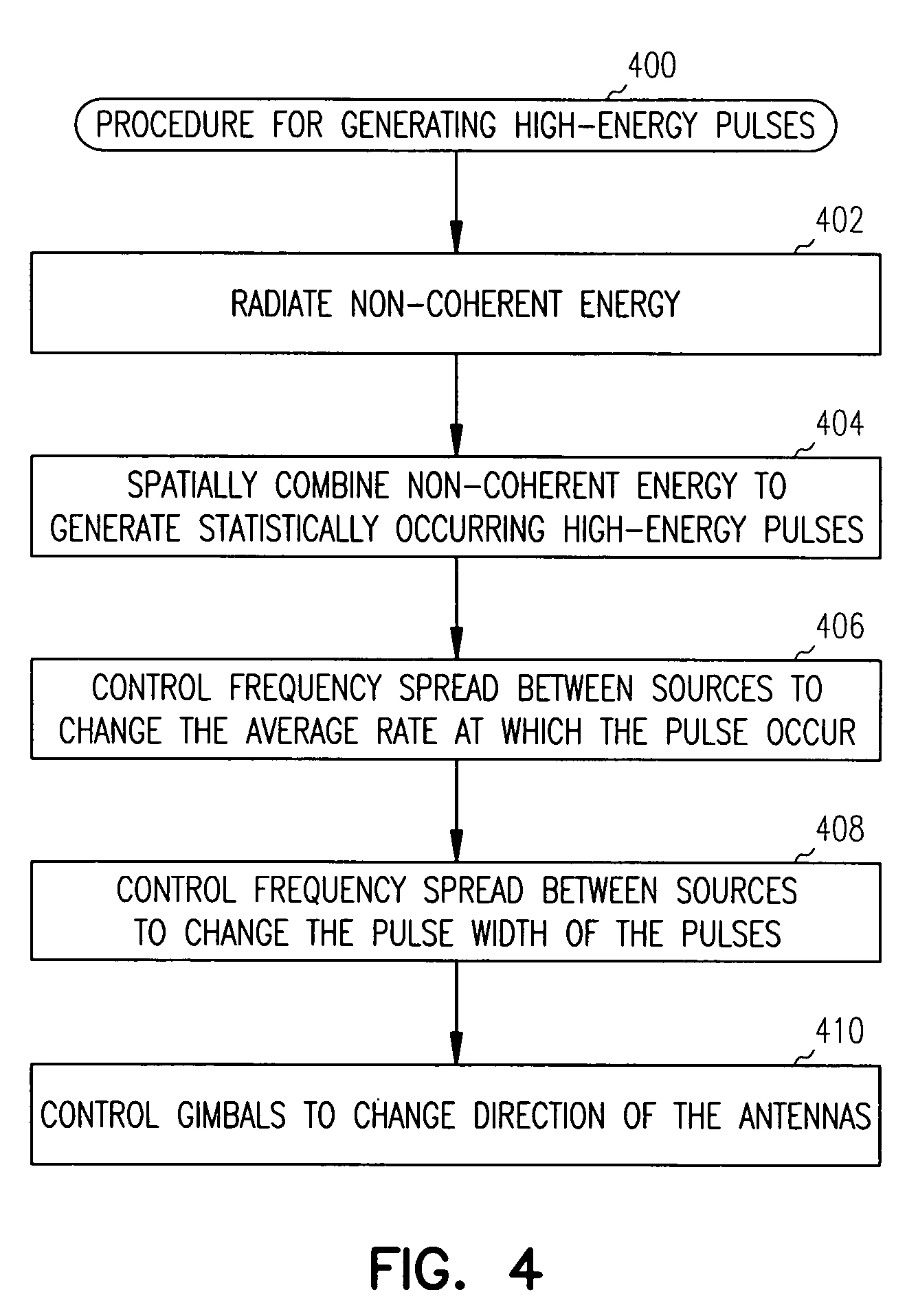 HIGO. 4 es un diagrama de flujo de un procedimiento para generar pulsos de alta energía de acuerdo con algunas realizaciones de la presente invención.. Procedimiento 400 puede realizarse mediante un sistema de energía dirigida, como el sistema 100 (HIGO. 1), aunque otros sistemas también pueden ser adecuados para realizar Procedimiento 400. Procedimiento 400 Puede usarse para generar pulsos de alta energía que ocurren estadísticamente utilizando una serie de fuentes no coherentes..